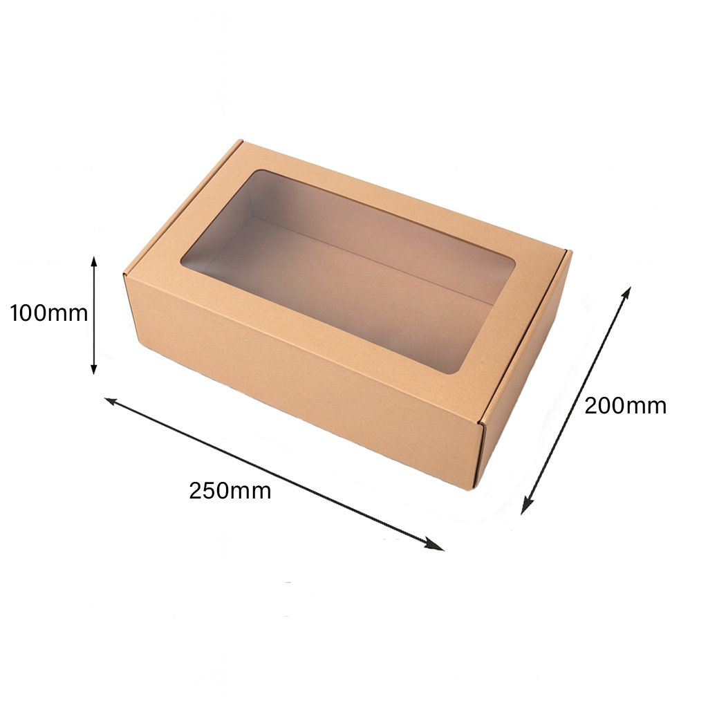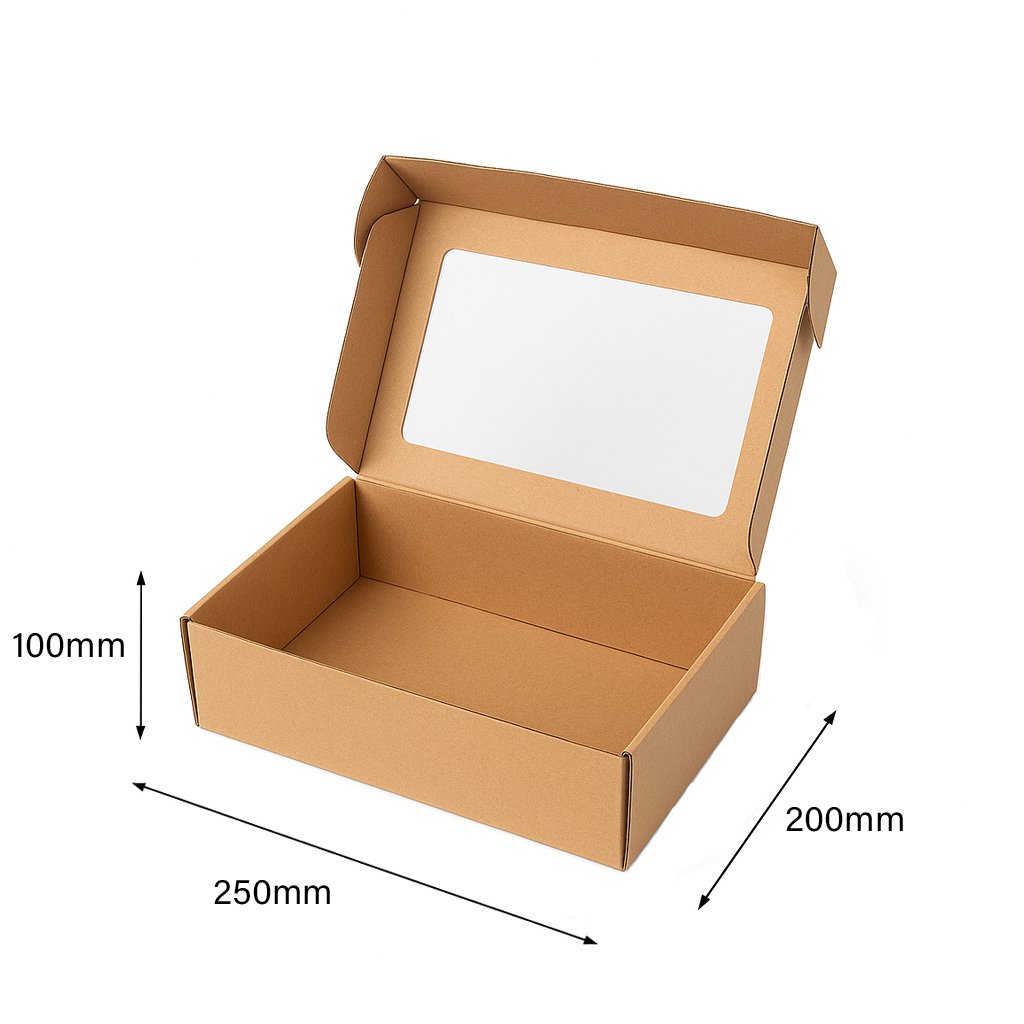Darčeková krabica s priehľadným vekom s rozmermi 250x200x100mm je vyrobená z 3-vrstvovej vlnitej lepenky. Tento druh krabice uľahčuje balenie akýchkoľvek produktov bez použitia lepiacej pásky.