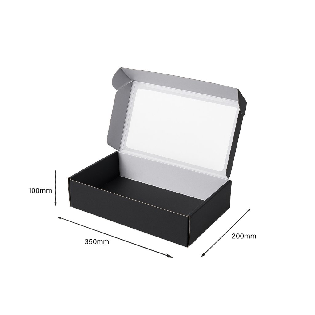Darčeková krabica s priehľadným vekom s rozmermi 350x200x100mm je vyrobená z 3-vrstvovej vlnitej lepenky. Tento druh krabice uľahčuje balenie akýchkoľvek produktov bez použitia lepiacej pásky.