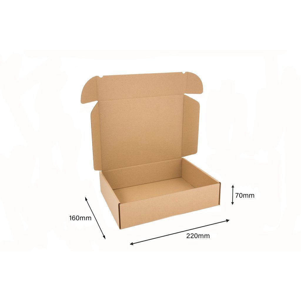 Poštová kartónová krabica s rozmermi 220x160x70mm je vyrobená z hnedej 3-vrstvovej vlnitej lepenky. Tento druh krabice uľahčuje balenie akýchkoľvek produktov bez použitia lepiacej pásky.