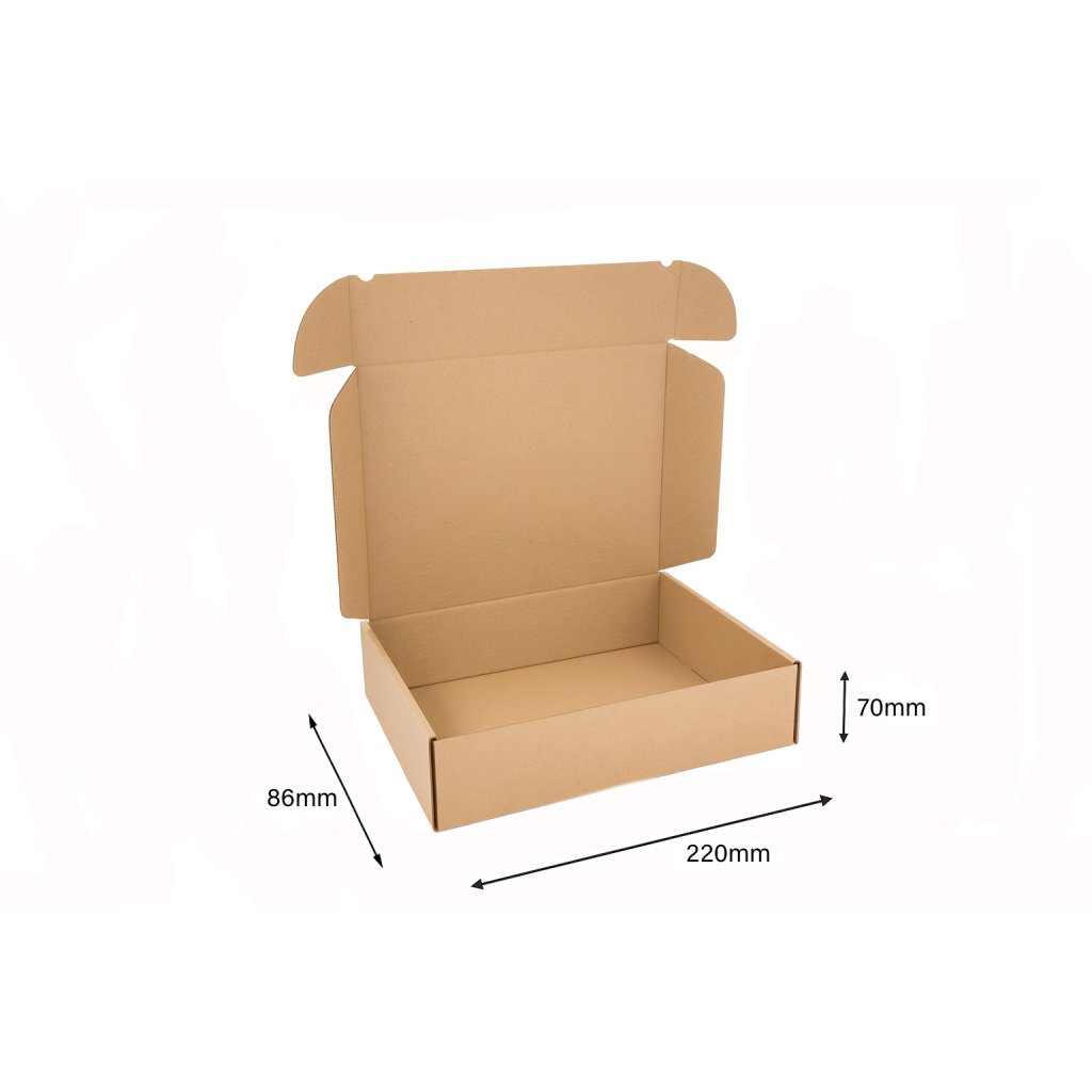 Poštová kartónová krabica s rozmermi 220x86x70mm je vyrobená z hnedej 3-vrstvovej vlnitej lepenky. Tento druh krabice uľahčuje balenie akýchkoľvek produktov bez použitia lepiacej pásky.
