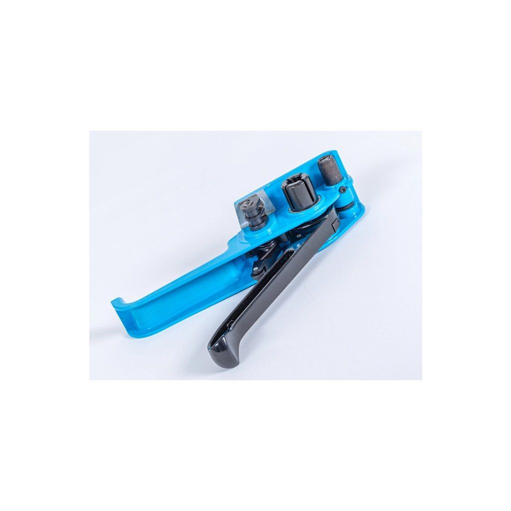 Napínač H-21 v modrej farbe je zariadenie určené na prácu s viazacími páskami so šírkou od 12 mm do 19 mm.