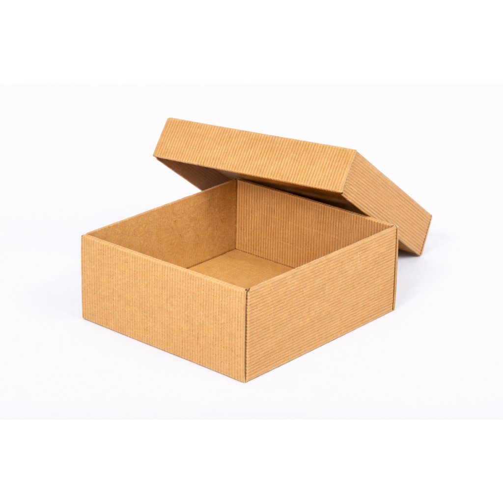 Darčeková krabica s vekom s rozmermi 150x150x70mm je vyrobená z 4-vrstvovej vlnitej lepenky. Tento druh krabice je vhodný na dekoračné balenie akýchkoľvek produktov bez použitia lepiacej pásky.