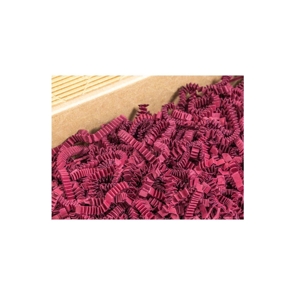 Papierová výplň do krabíc – zigzag v bordovej farbe je prírodný a ekologický výplňový a dekoračný materiál vyrobený z narezaných a skrútených papierových hárkov. Najčastejšie sa využívajú na vyplnenie prázdnych priestorov v prepravovaných balíkoch. Papierová výplň je ľahká a nemá výrazný vplyv na hmotnosť zásielky.